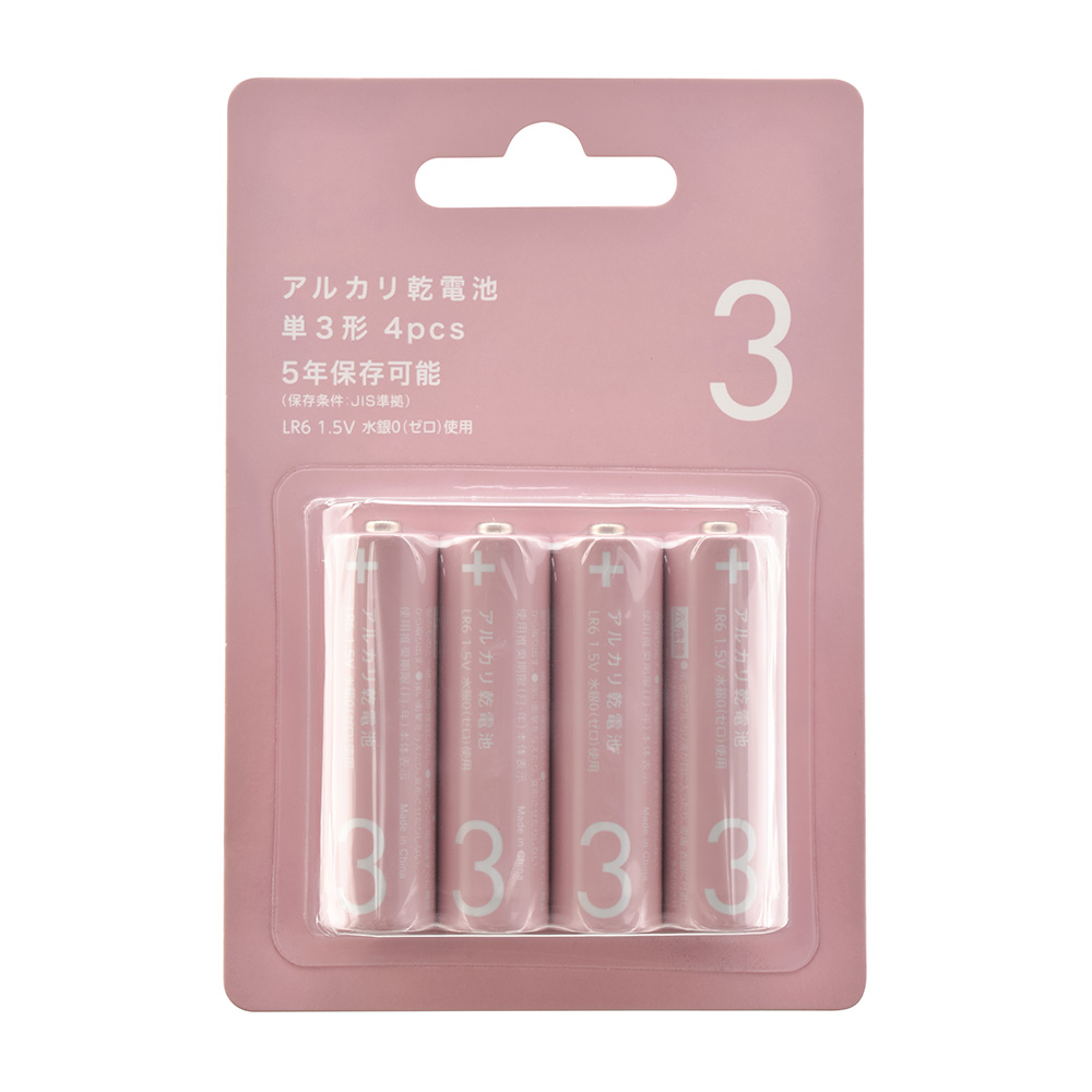 アルカリ乾電池 単3形 4本パック ピンク [品番]08-4168
