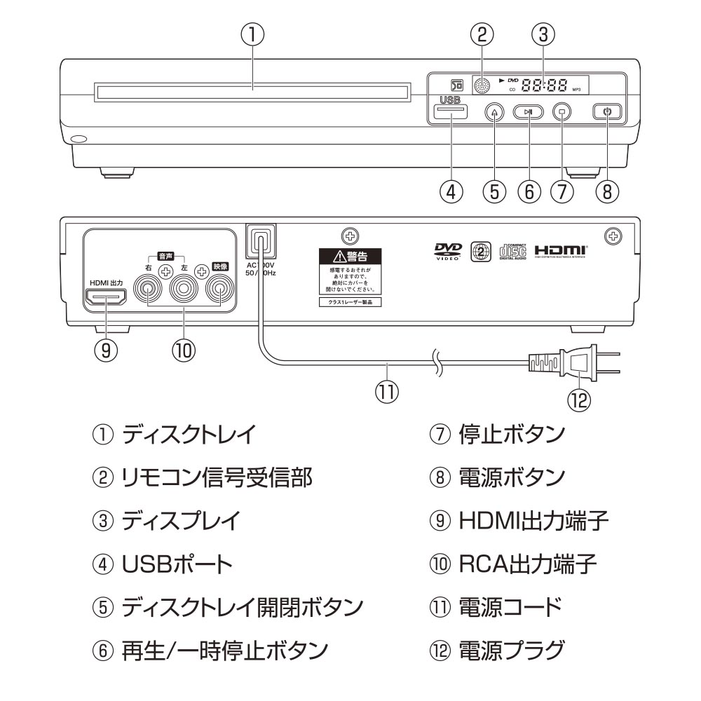 ■ 対応フォーマット(ディスク):DVD-Video、DVD-VR (CPRM)、VCD、CD-DA、MP3、MPEG-4(AVI形式 720×480/576対応)、JPEG