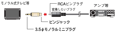 - ● アンプ等のピンプラグをモノラル式テレビ等のφ3.5モノラルミニプラグに変換します。