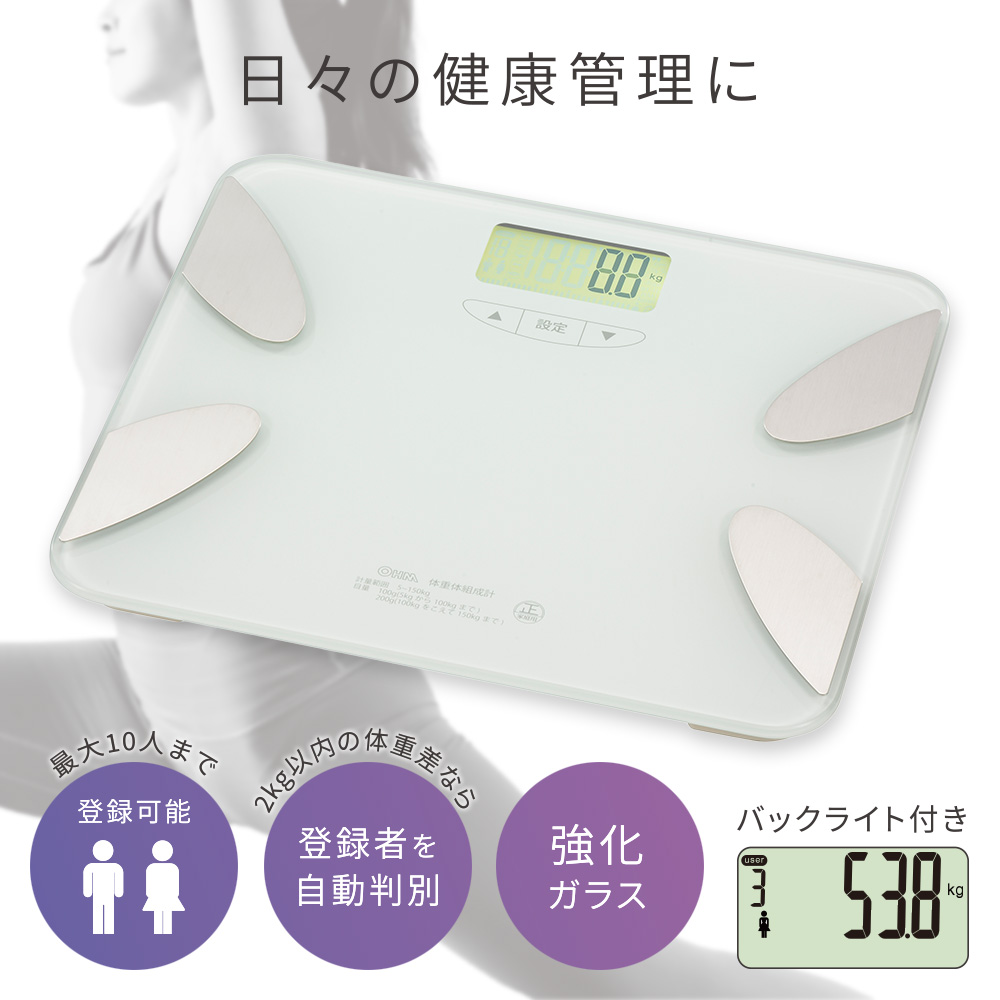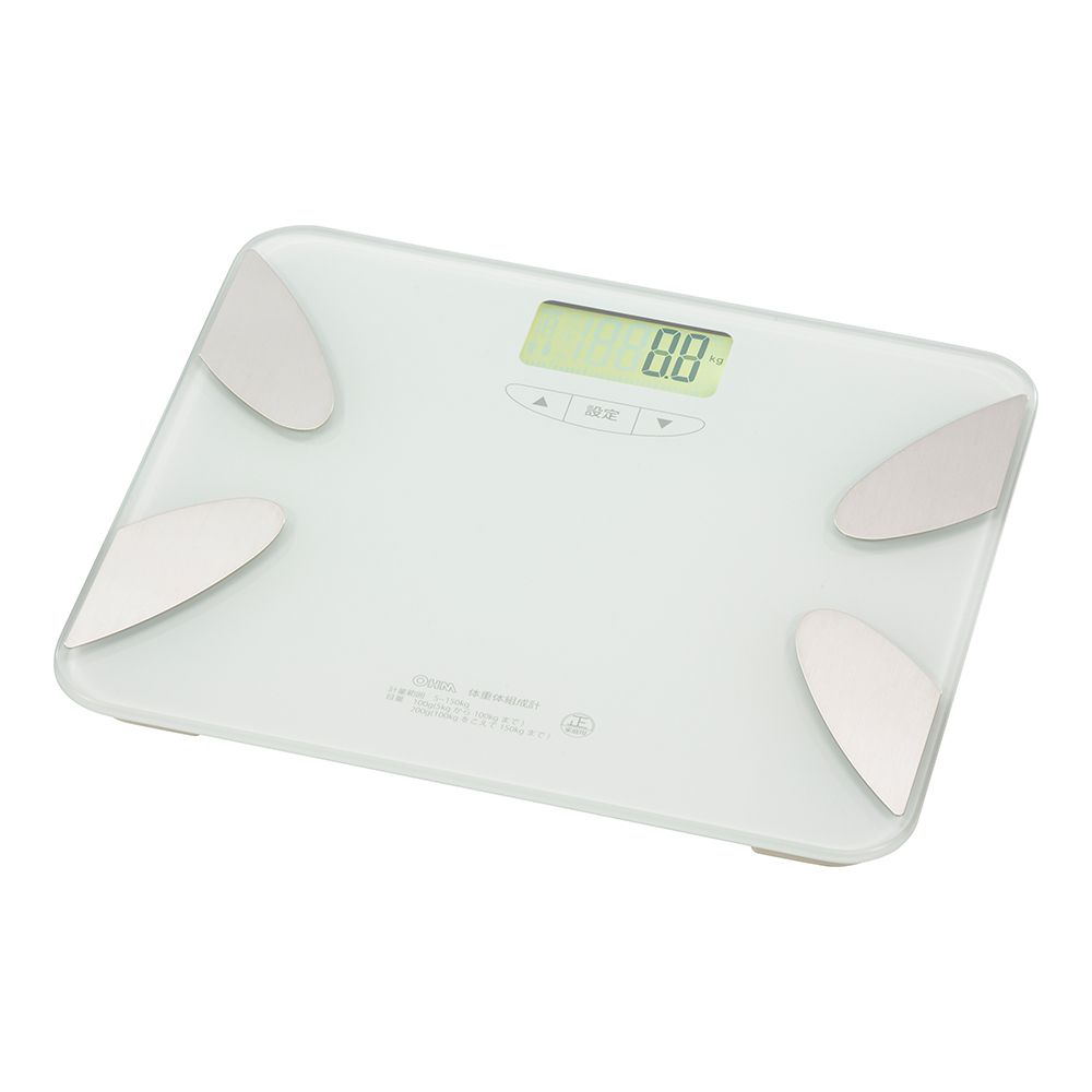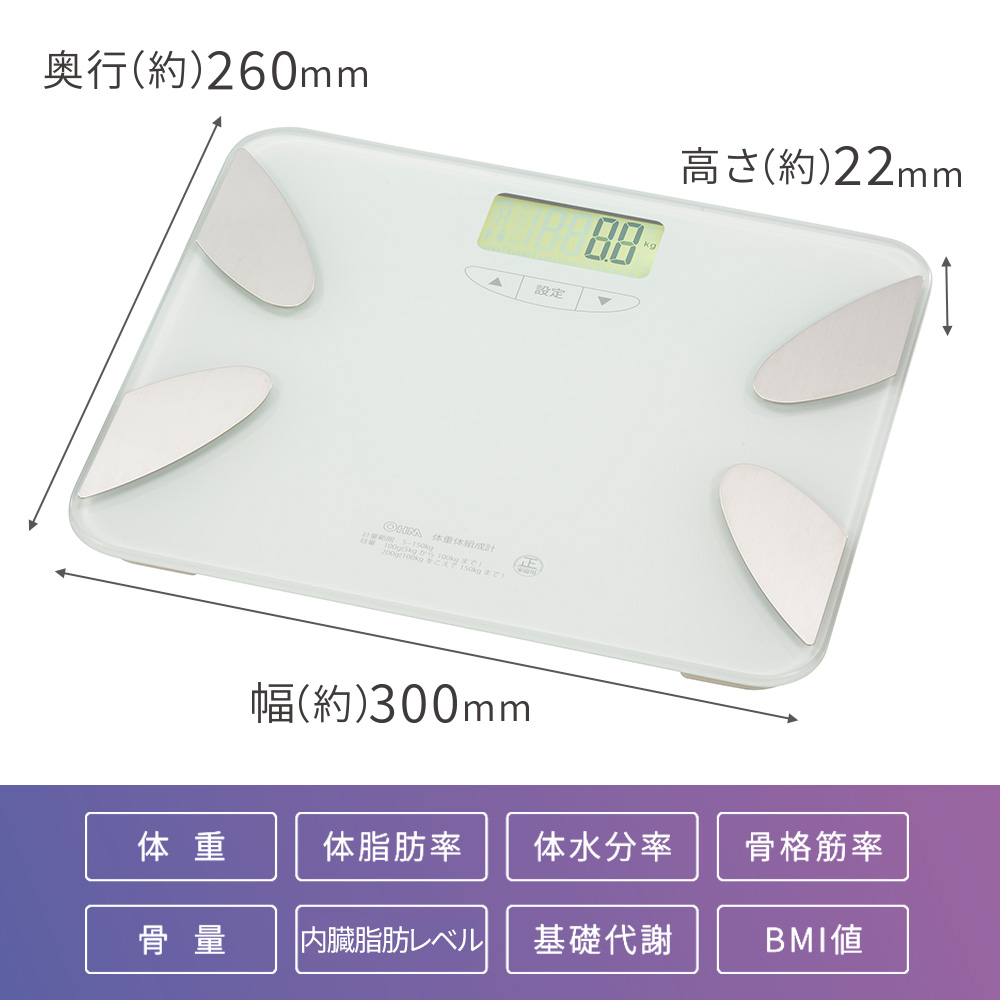- ● 体重、体脂肪率、体水分率、骨格筋率、骨量、内臓脂肪レベル、基礎代謝、BMI値が測れる