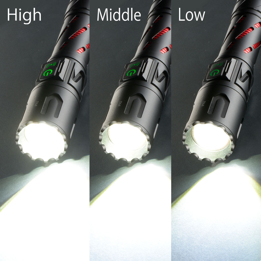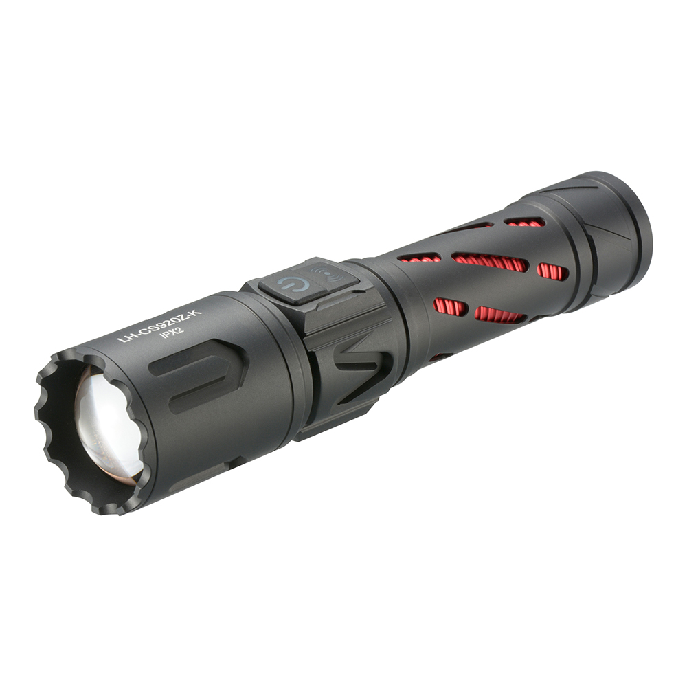 ■ 光束(ルーメン):約920 lm(High)…2時間、約500 lm(Middle)…3時間、約260 lm(Low)…8時間、フラッシュ…2時間、SOS…2.5時間 ※満充電時 ※環境温度などにより異なります。 ※簡易的に本体照明部分を積分球に入れ、満充電で実測した数値