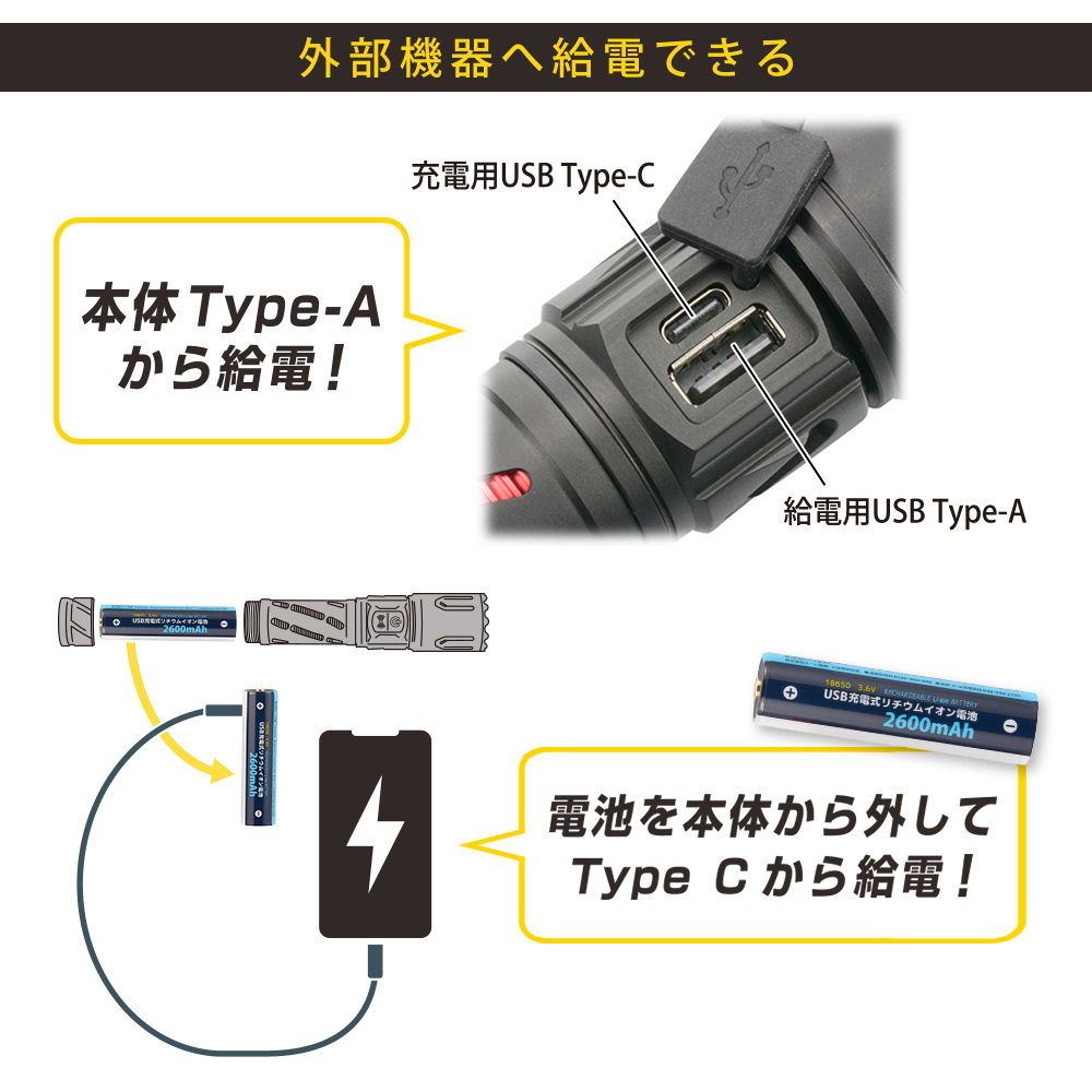 ■ 付属品:ストラップ・USBケーブル、18650 リチウムイオン電池(3.6V 2600mAh)