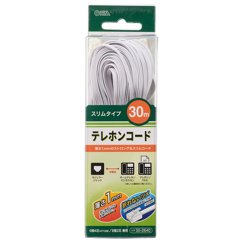 - ● 厚さ1mmながら通常の電話コードよりもタフな、スリムタイプのテレホンコード