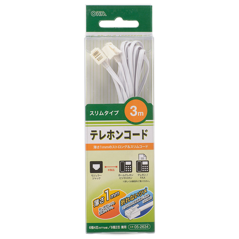 - ● 厚さ1mmながら通常の電話コードよりもタフな、スリムタイプのテレホンコード