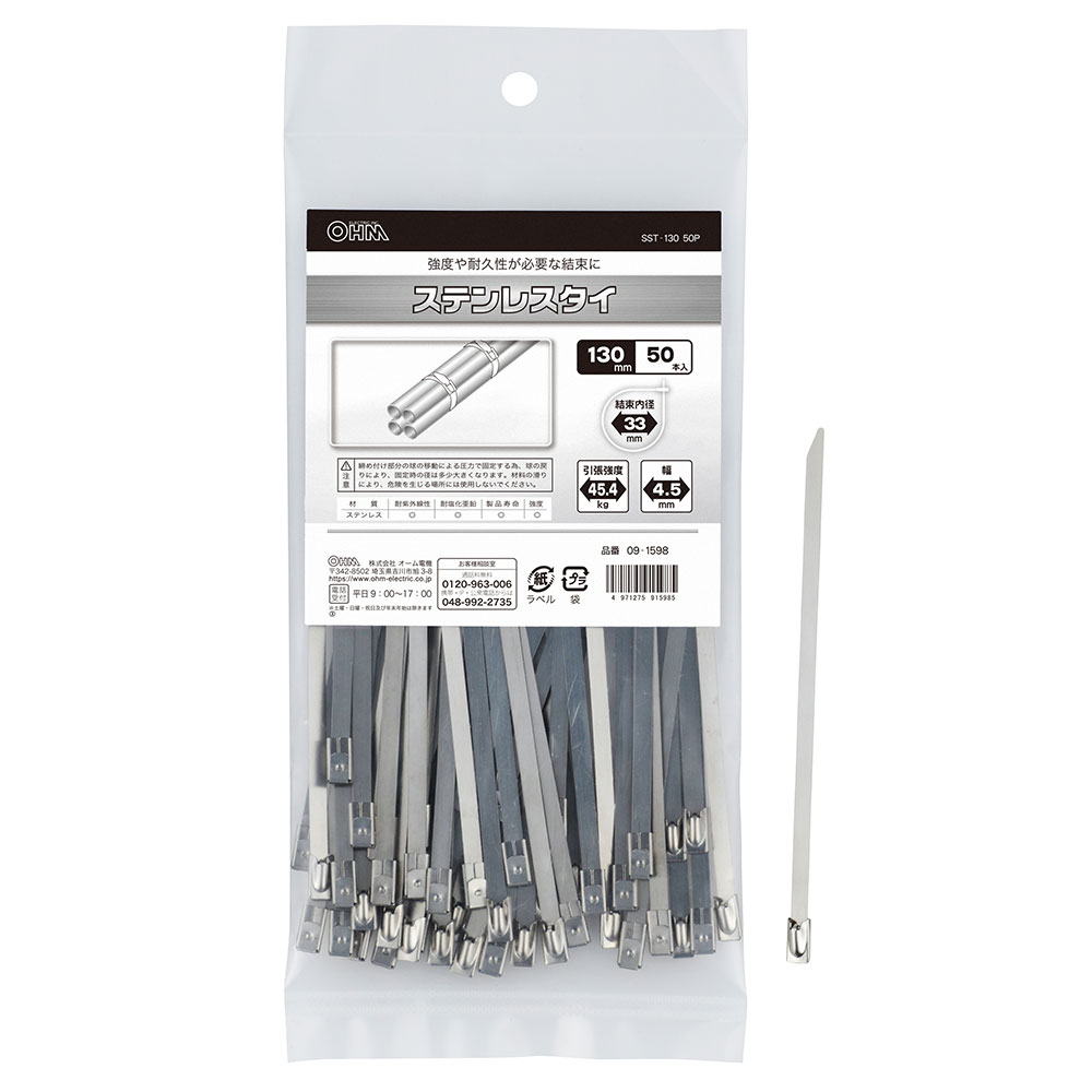 ■ 長さ:130mm ■ 結束内径:33mm ■ 幅:4.5mm ■ 引張強度 45.4kg ■ 材質:ステンレス ■ 50本入り