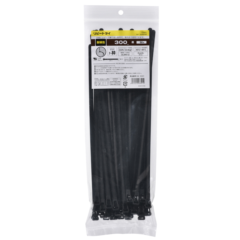 リピートタイ 耐候性 300mm 黒 50本入 [品番]04-3301