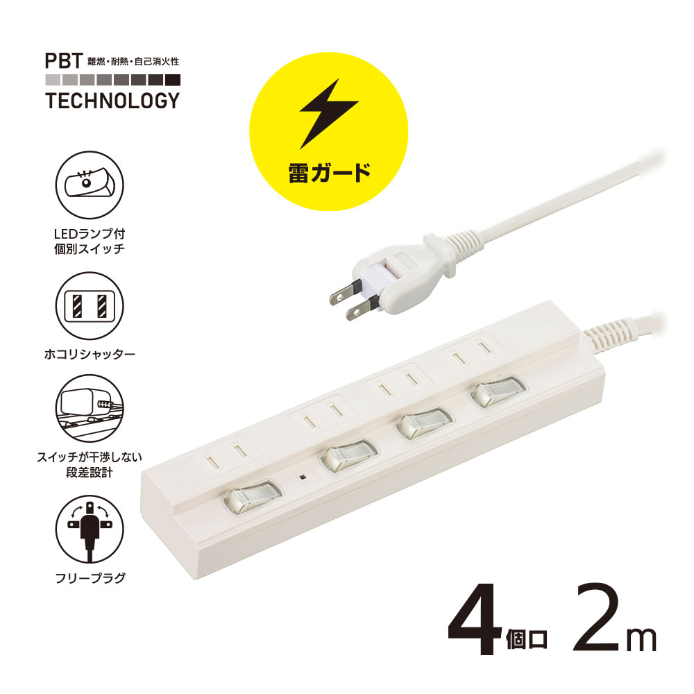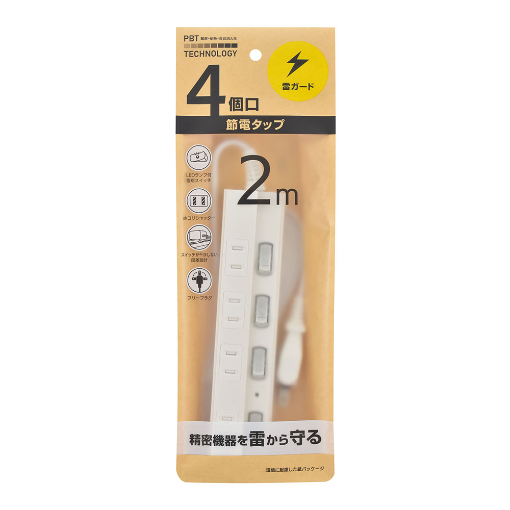 - 雷ガード付き節電タップ 4個口 2m [品番]00-1585