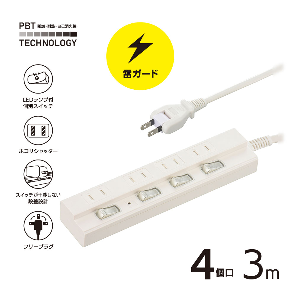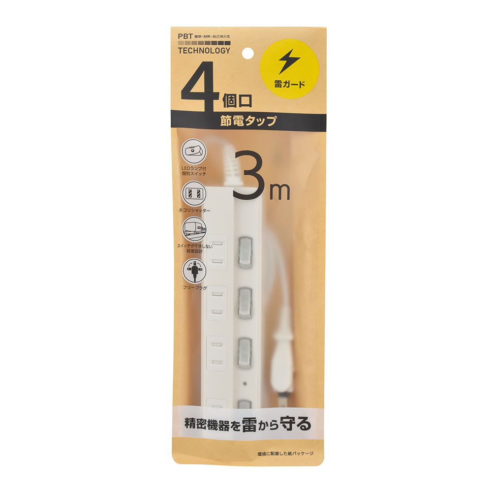 - 雷ガード付き節電タップ 4個口 3m [品番]00-1586
