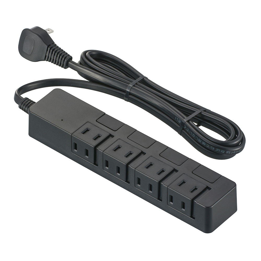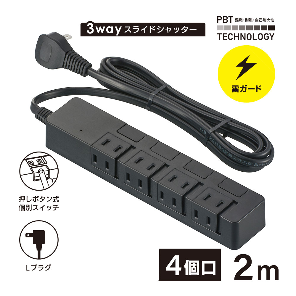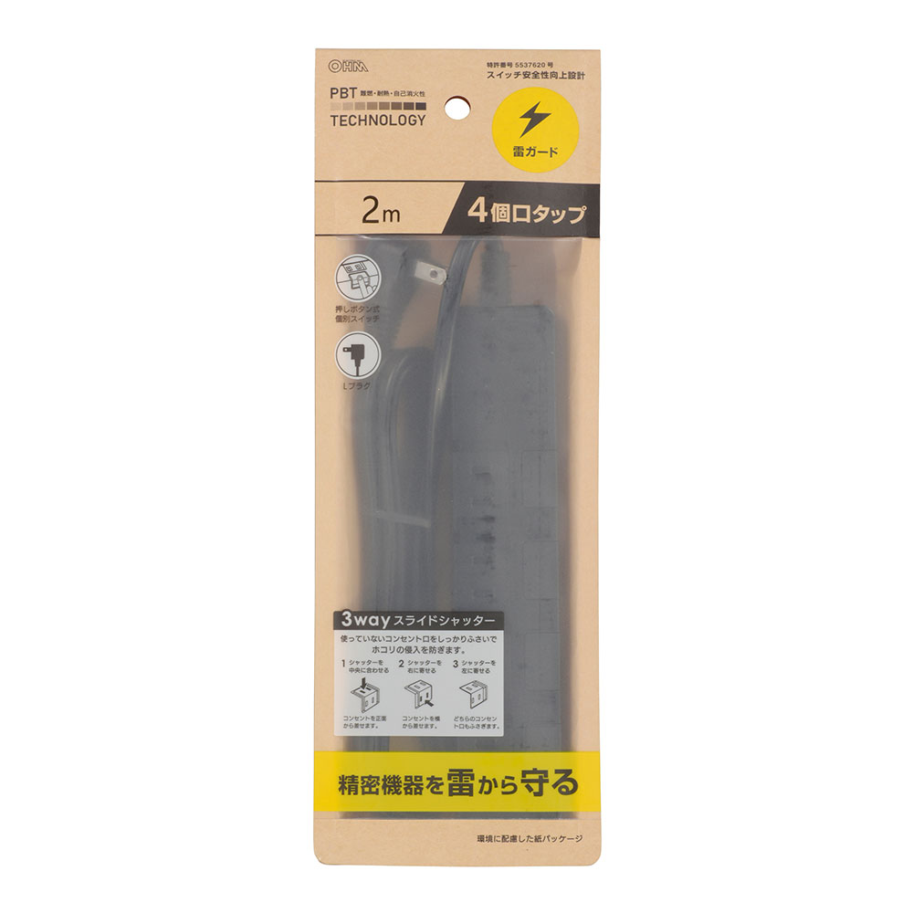 - 雷ガード付き電源タップ 4個口 2m 黒 [品番]00-1643