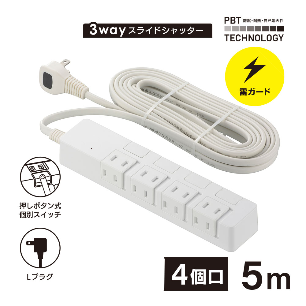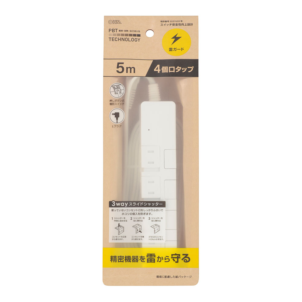 - 雷ガード付き電源タップ 4個口 5m 白 [品番]00-1645