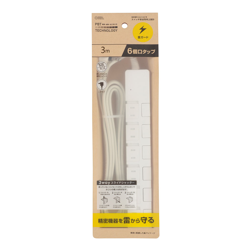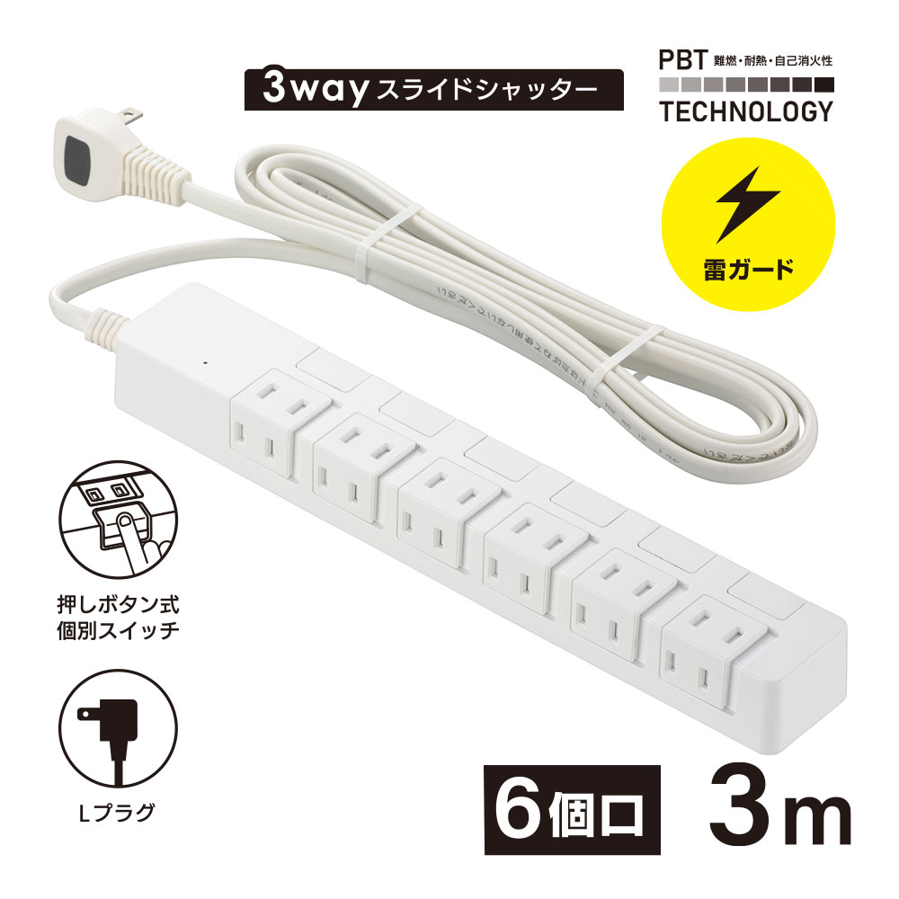 - 雷ガード付き電源タップ 6個口 3m?白 [品番]00-1665