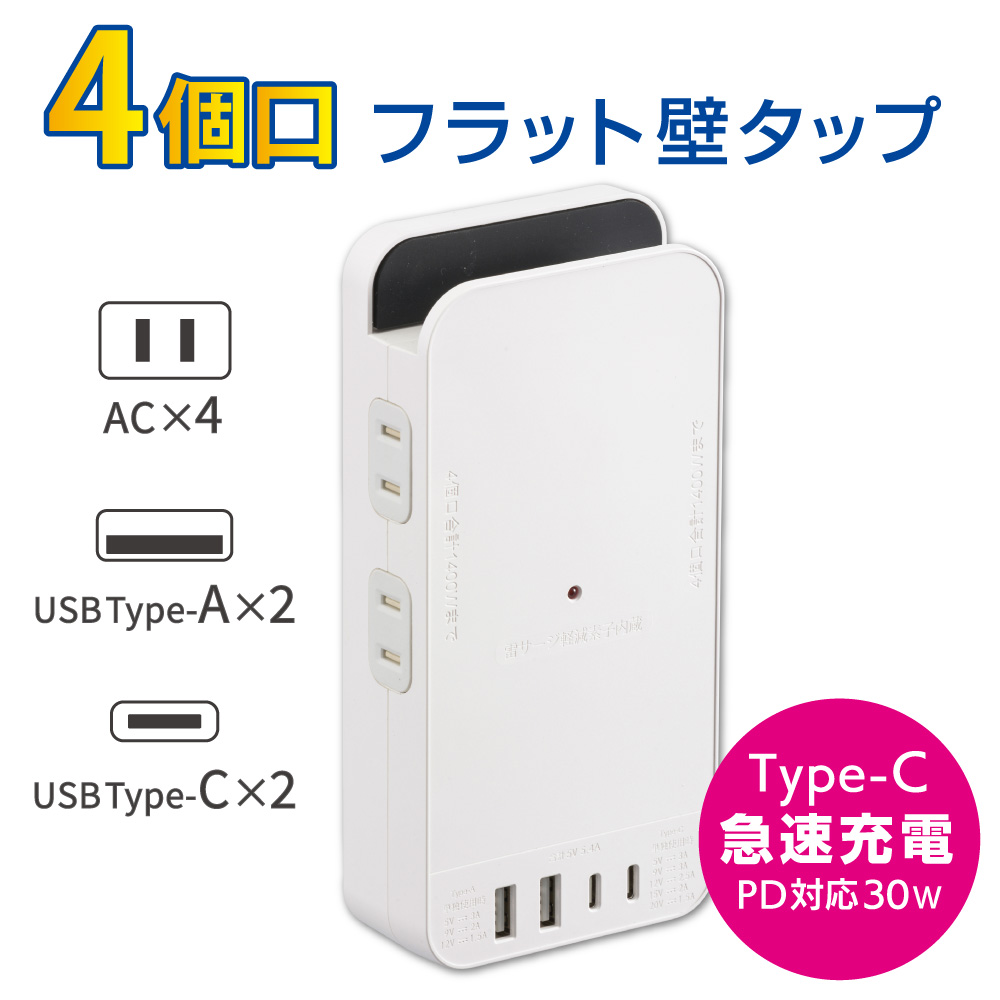 - フラット壁タップ PD対応30W 4個口 白 [品番]00-1080