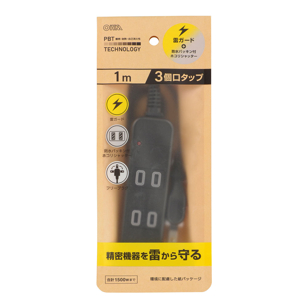 - 雷ガード付き安全タップ 3個口 1m 黒 [品番]00-1040