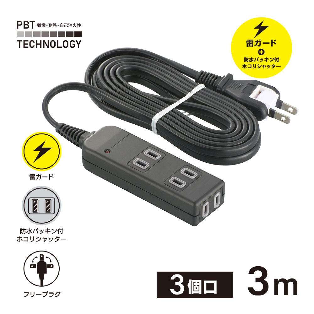 雷ガード付きタップ 3個口 3m 黒 [品番]00-1044