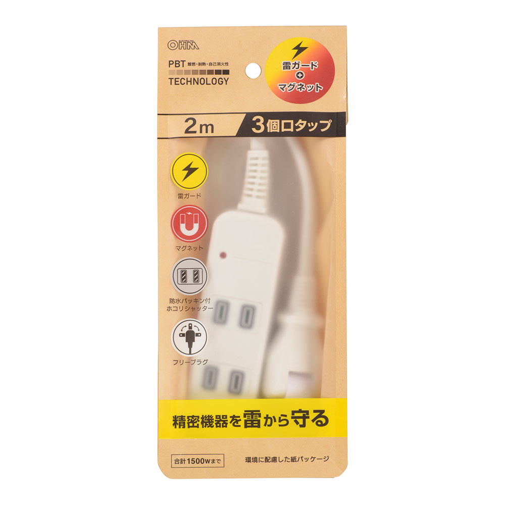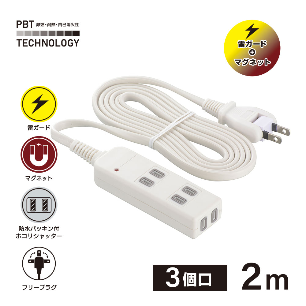 雷ガード・マグネット付タップ 3個口 2m 白 [品番]00-1706