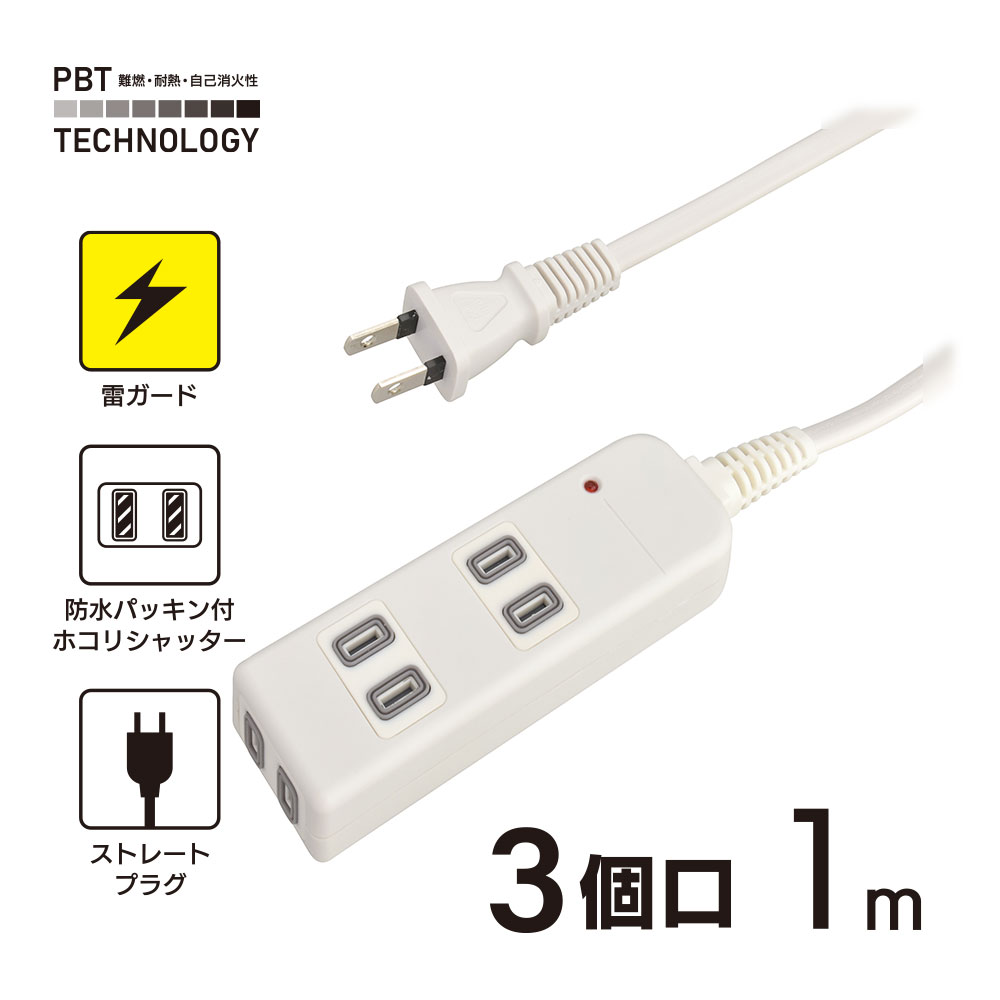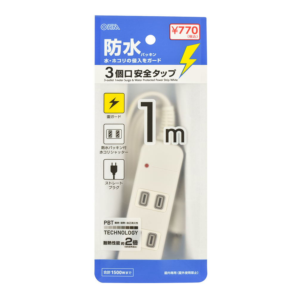 - 雷ガード付き3個口安全タップ 防水パッキン付 1m 白 [品番]00-1764