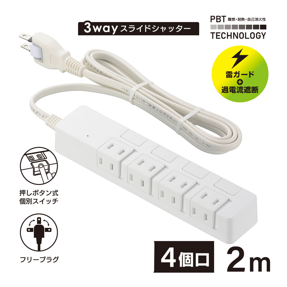 - 雷ガード+過電流遮断付き電源タップ 4個口 2m [品番]00-1646