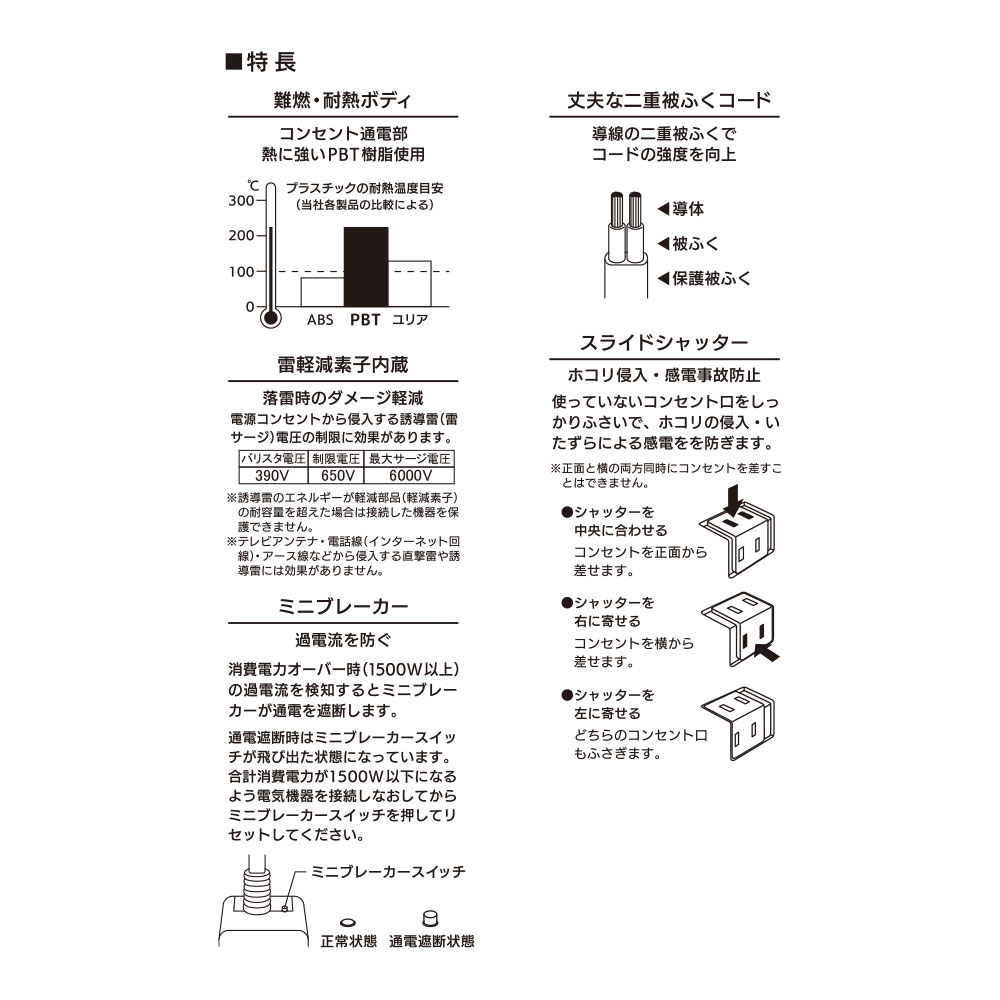 - ● コンセント通電部熱に強いPBT樹脂使用の難燃・耐熱ボディ
