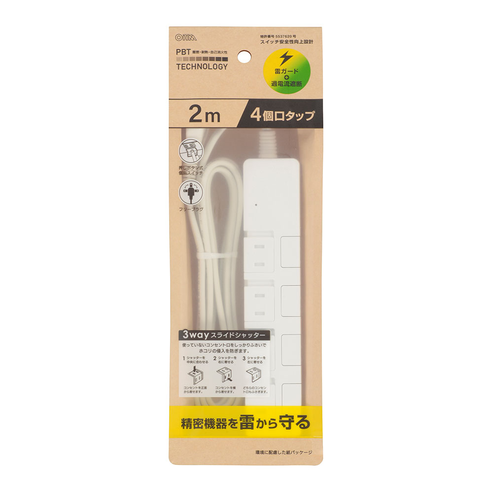 雷ガード+過電流遮断付き電源タップ 4個口 2m [品番]00-1646