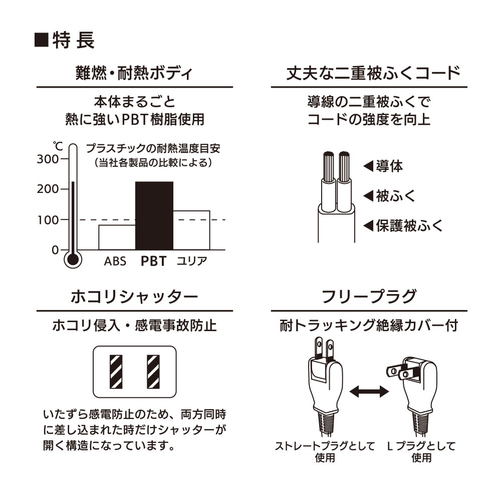- ● 本体まるごと熱に強いPBT樹脂使用の難燃・耐熱ボディ