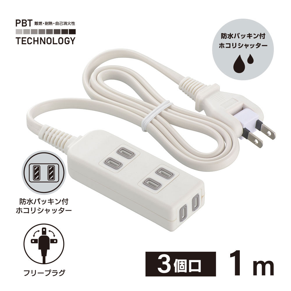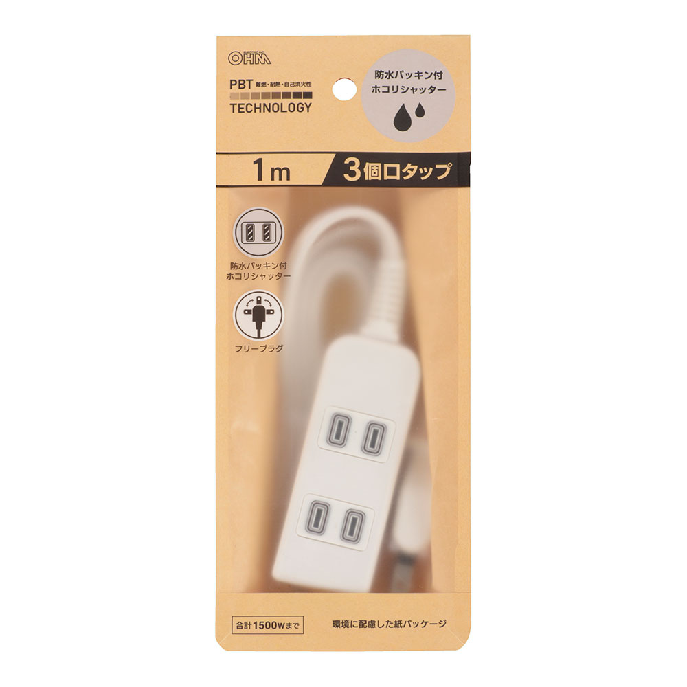- 防水パッキン付きホコリシャッタータップ 3個口 1m 白 [品番]00-1636