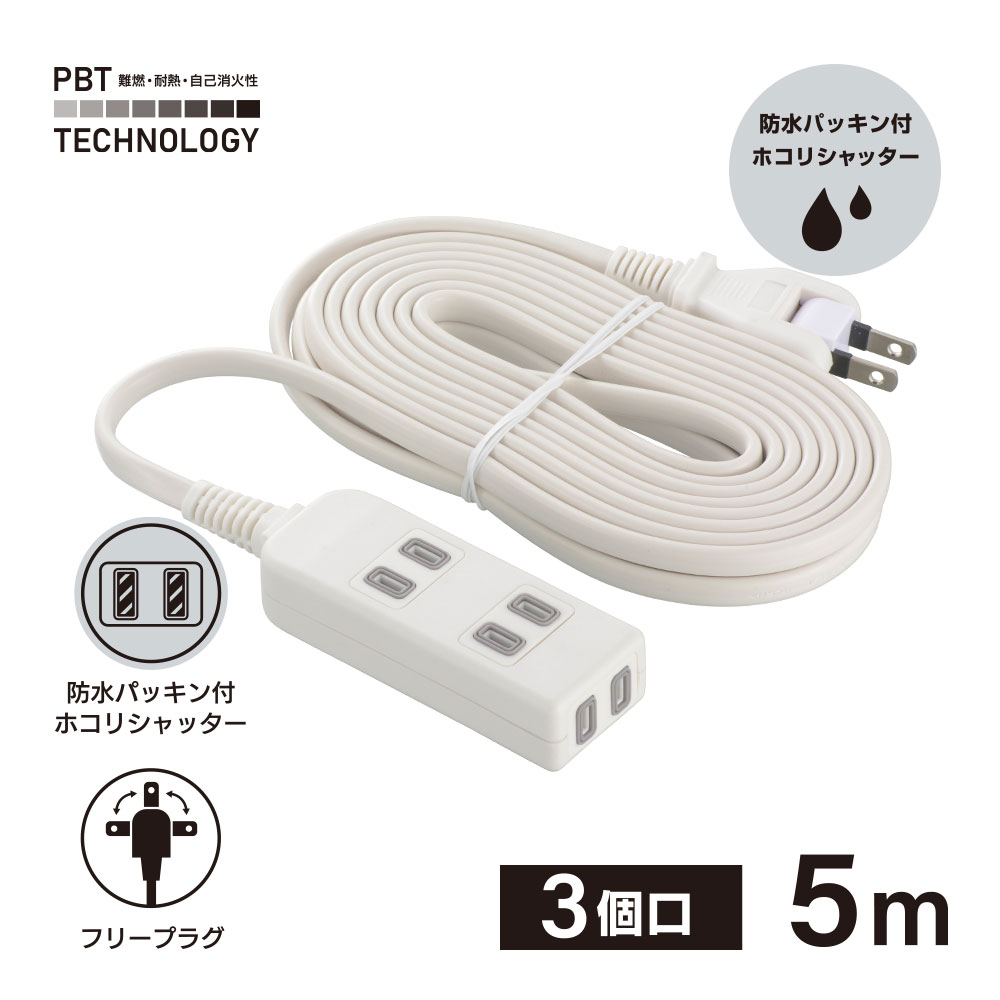 防水パッキン付きホコリシャッタータップ 3個口 5m 白 [品番]00-1639
