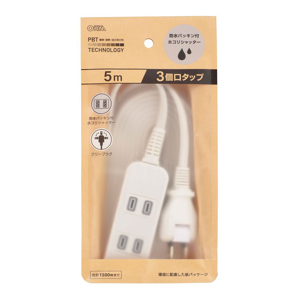 - 防水パッキン付きホコリシャッタータップ 3個口 5m 白 [品番]00-1639