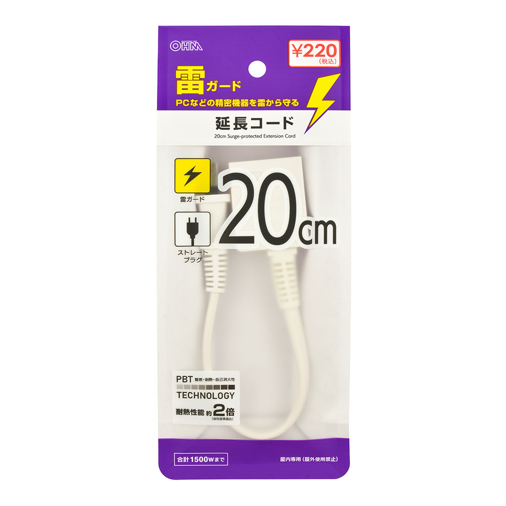 - 雷ガード付き延長コード 20cm [品番]00-1768