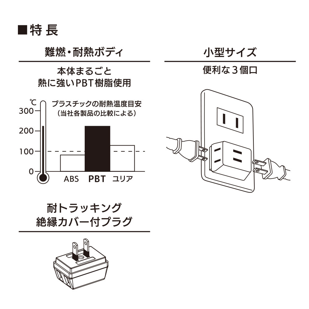 - ● 本体まるごと熱に強いPBT樹脂使用の難燃・耐熱ボディ