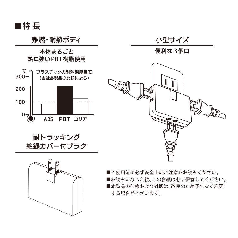 - ● 本体まるごと熱に強いPBT樹脂使用の難燃・耐熱ボディ