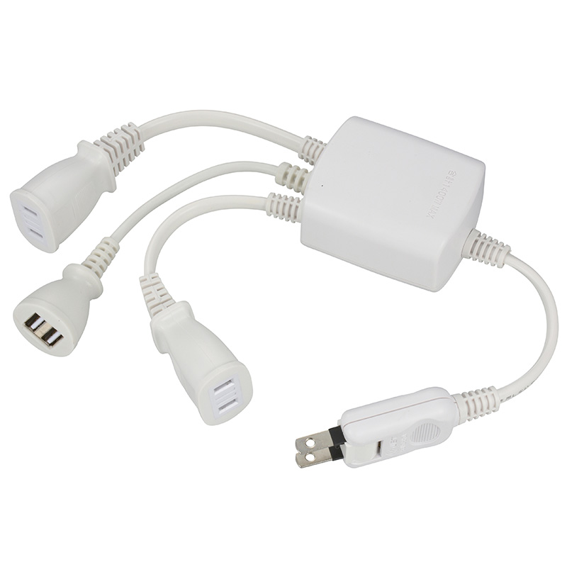 - ● コンセント2口とUSBポート2口をケーブルで分配。接続口が離れているためACアダプターに便利です。