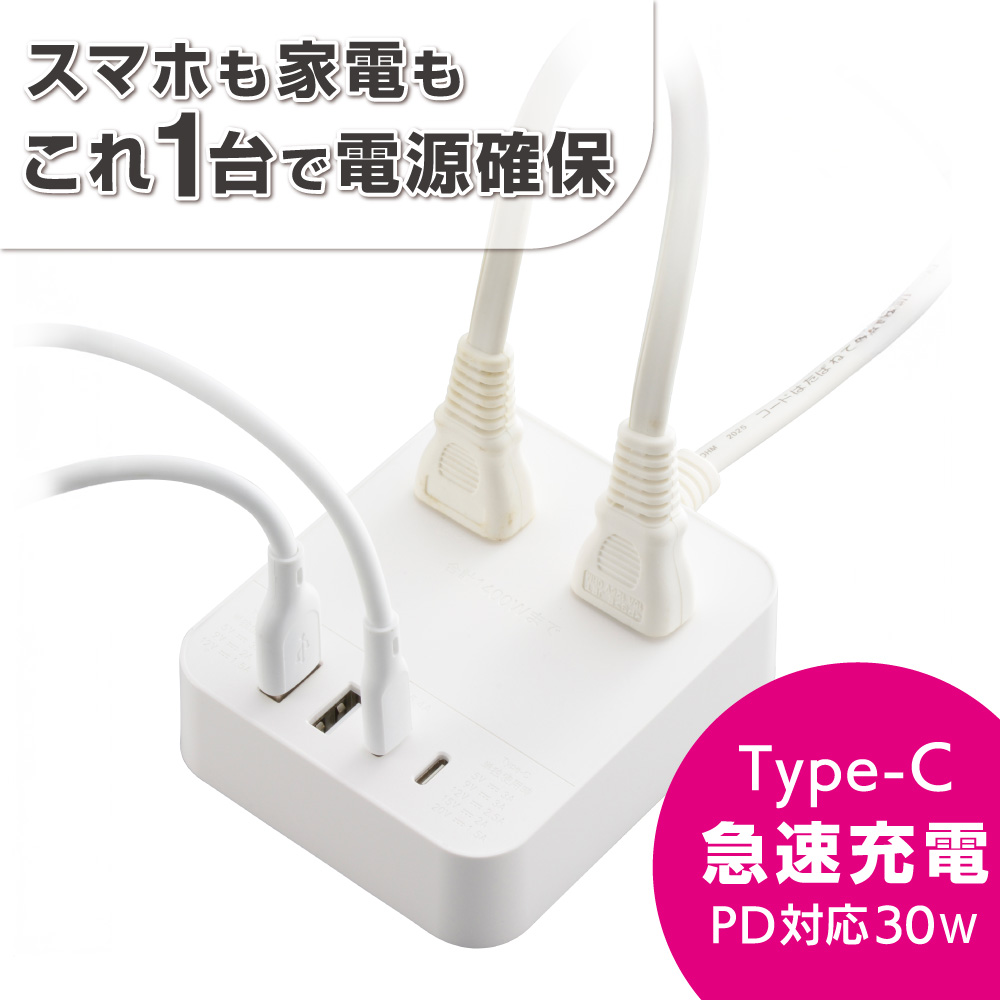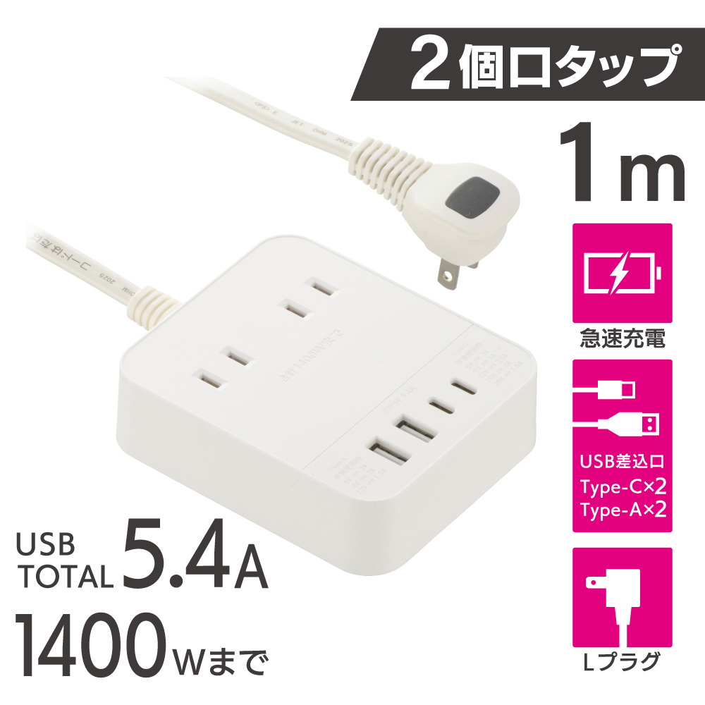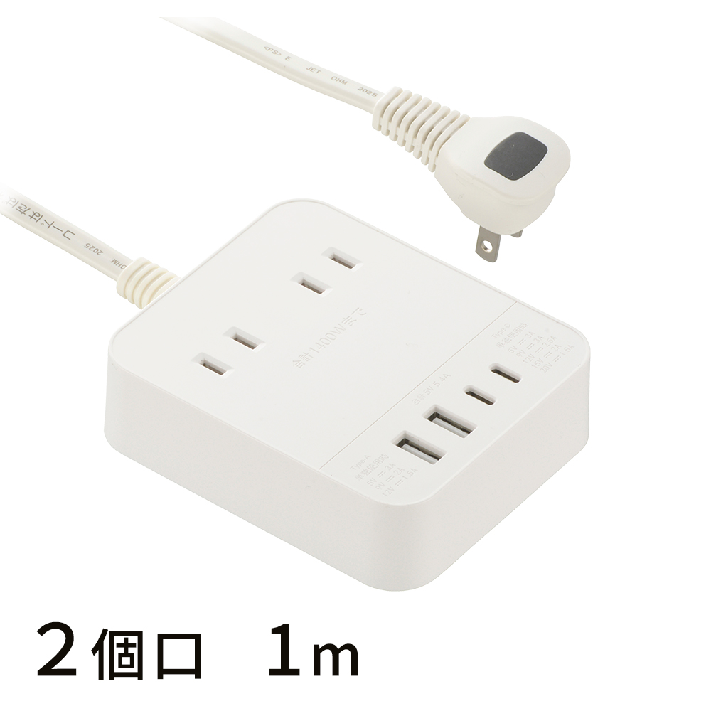 - 2個口タップ PD対応30W 1m 白 [品番]00-1081
