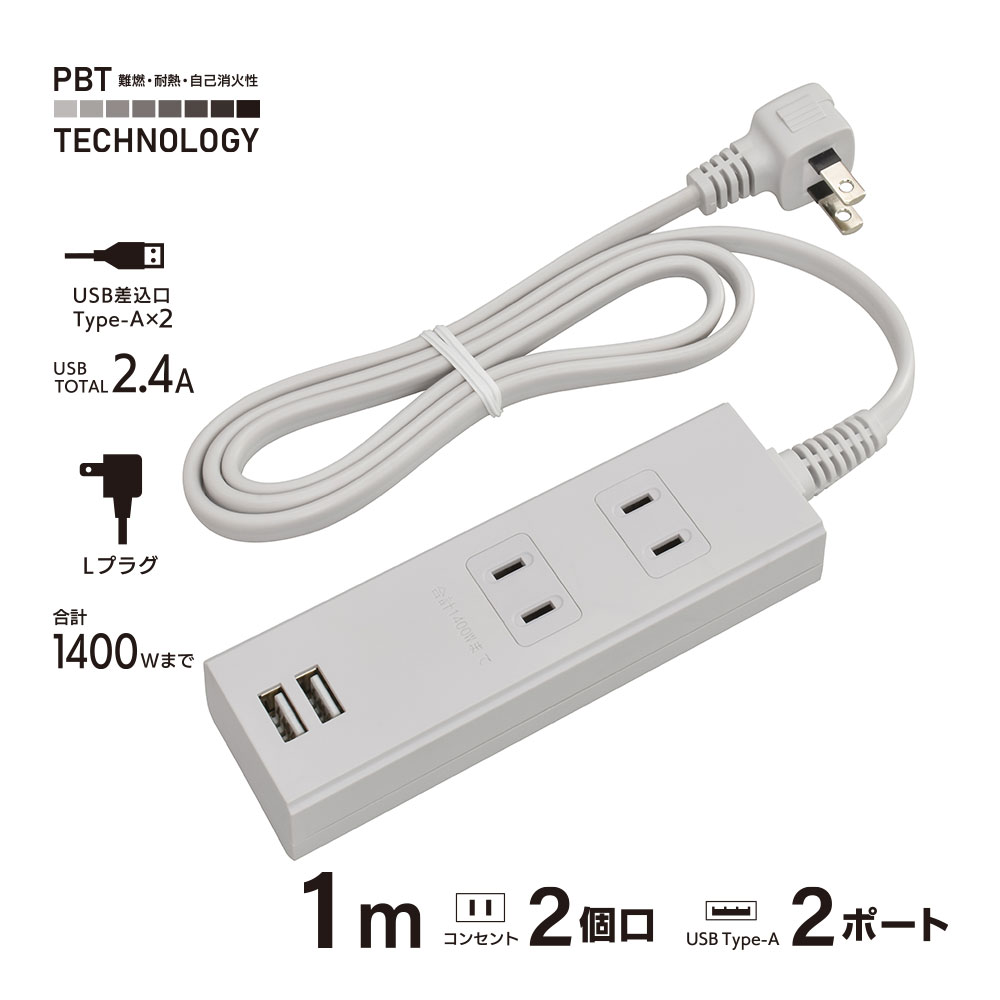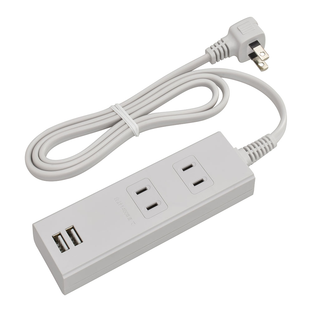 - 電源タップ 2個口 USBポート付 1m グレー [品番]00-1671