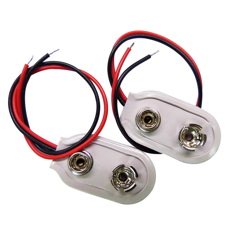 ■ 乾電池006P(電圧9V)用 ■ リード線:赤… +(プラス)/黒… -(マイナス) ■ リード線長さ:10cm ■ 入数:2個