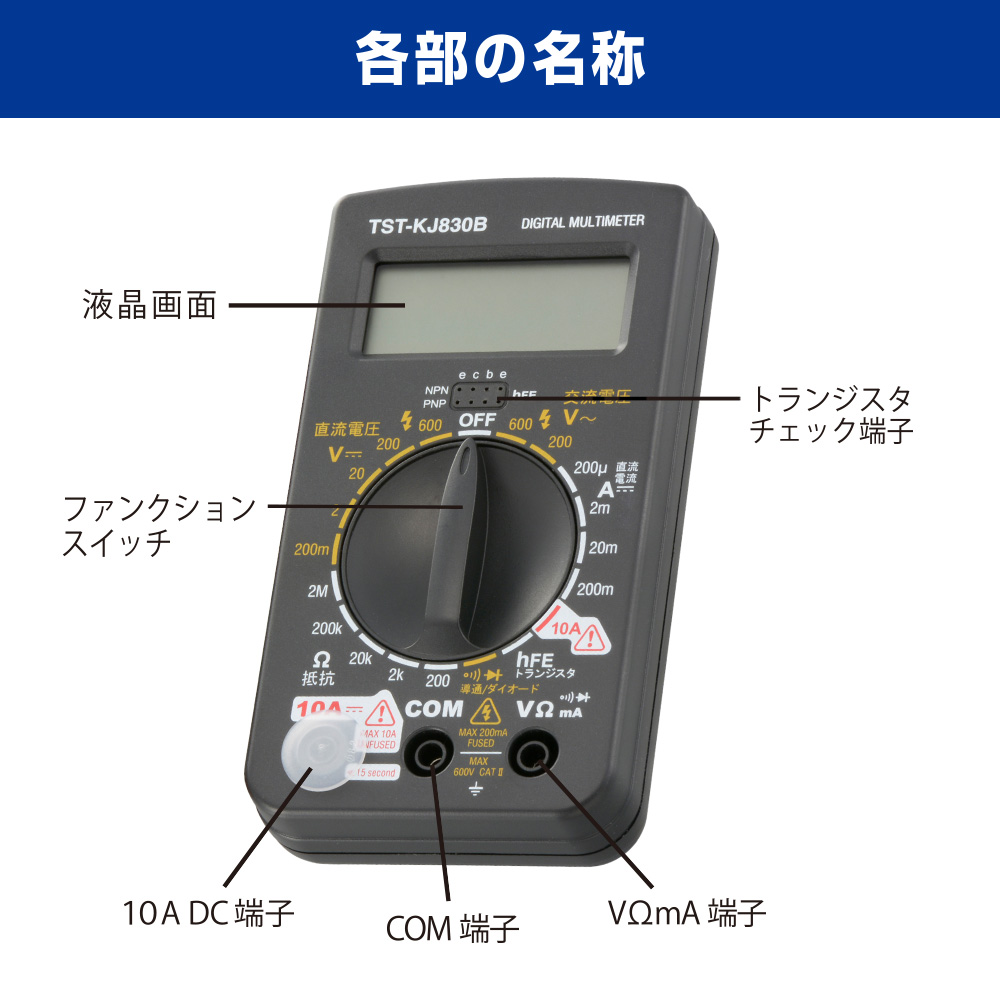※ 感電事故ならびにテスターの焼損を防ぐために、600V以上の電圧を測定しないでください。なお、安全のため2kVA以上の容量の強電回路は測定しないでください。