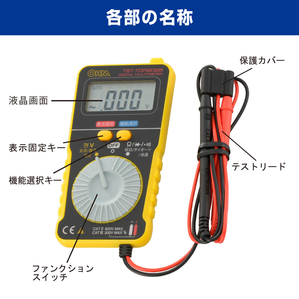 ※ 感電事故ならびにテスターの焼損を防ぐために、600V以上の電圧を測定しないでください。なお、安全のため6kVA以上の容量の強電回路は測定しないでください。