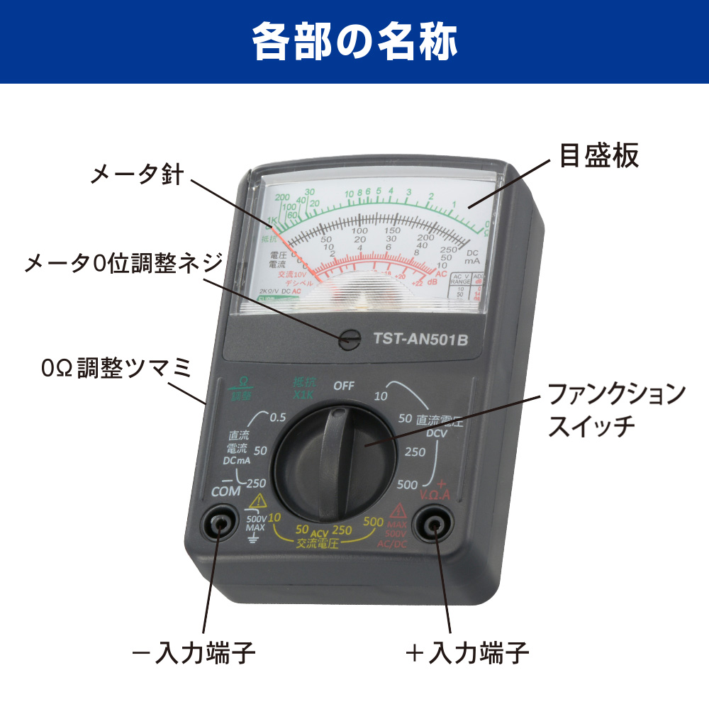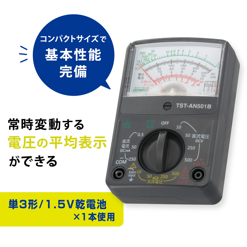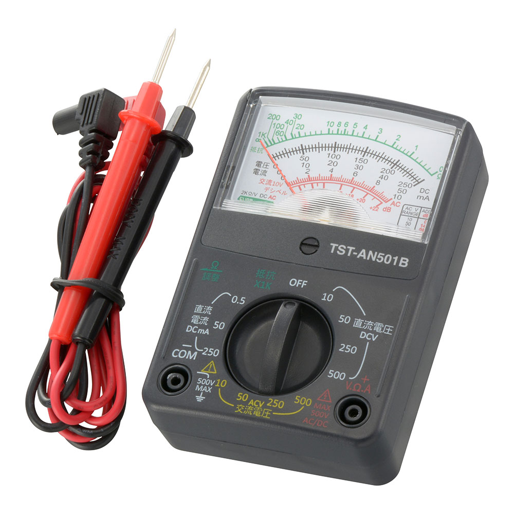 ※ このテスターは弱電用(500V以下)対応です。500V以上の高圧回路では使用しないでください。また、それ以下であっても250V以上の強電(工業用電力ライン)や高周波機器(電子レンジ等)の高圧測定は危険ですので、絶対にしないでください。人身事故や感電事故の原因となります。