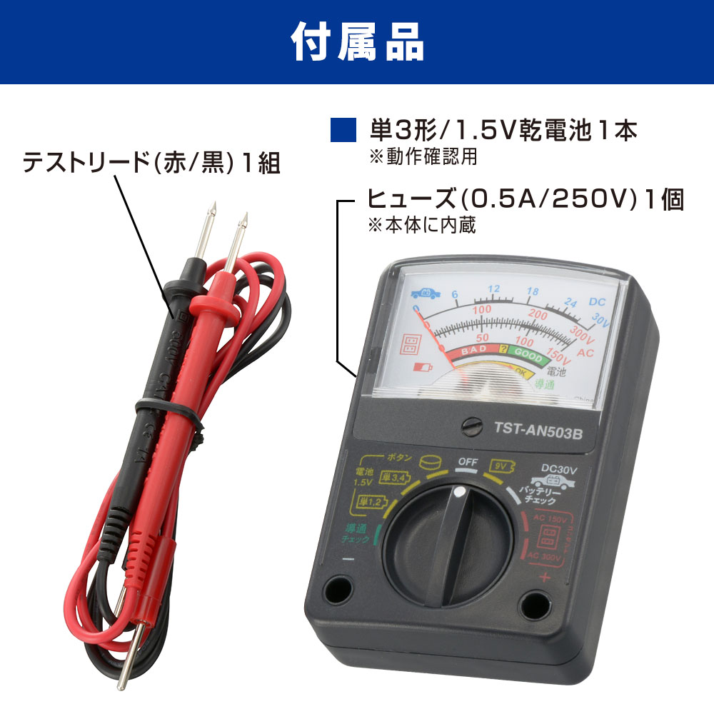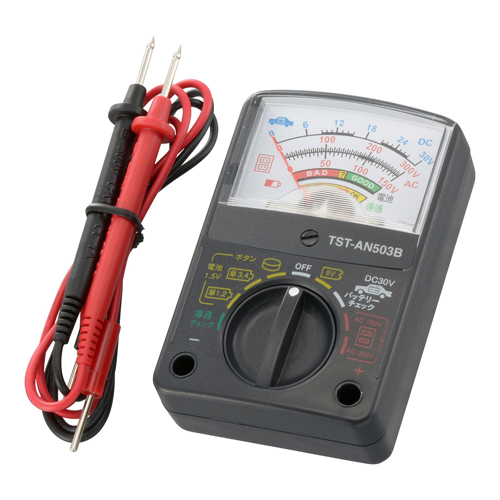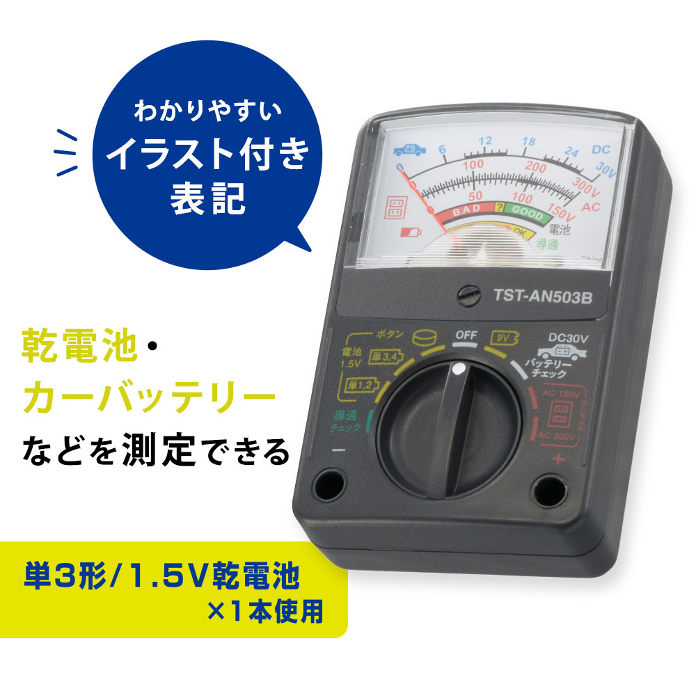 - ● 乾電池・カーバッテリーなどを測定できる