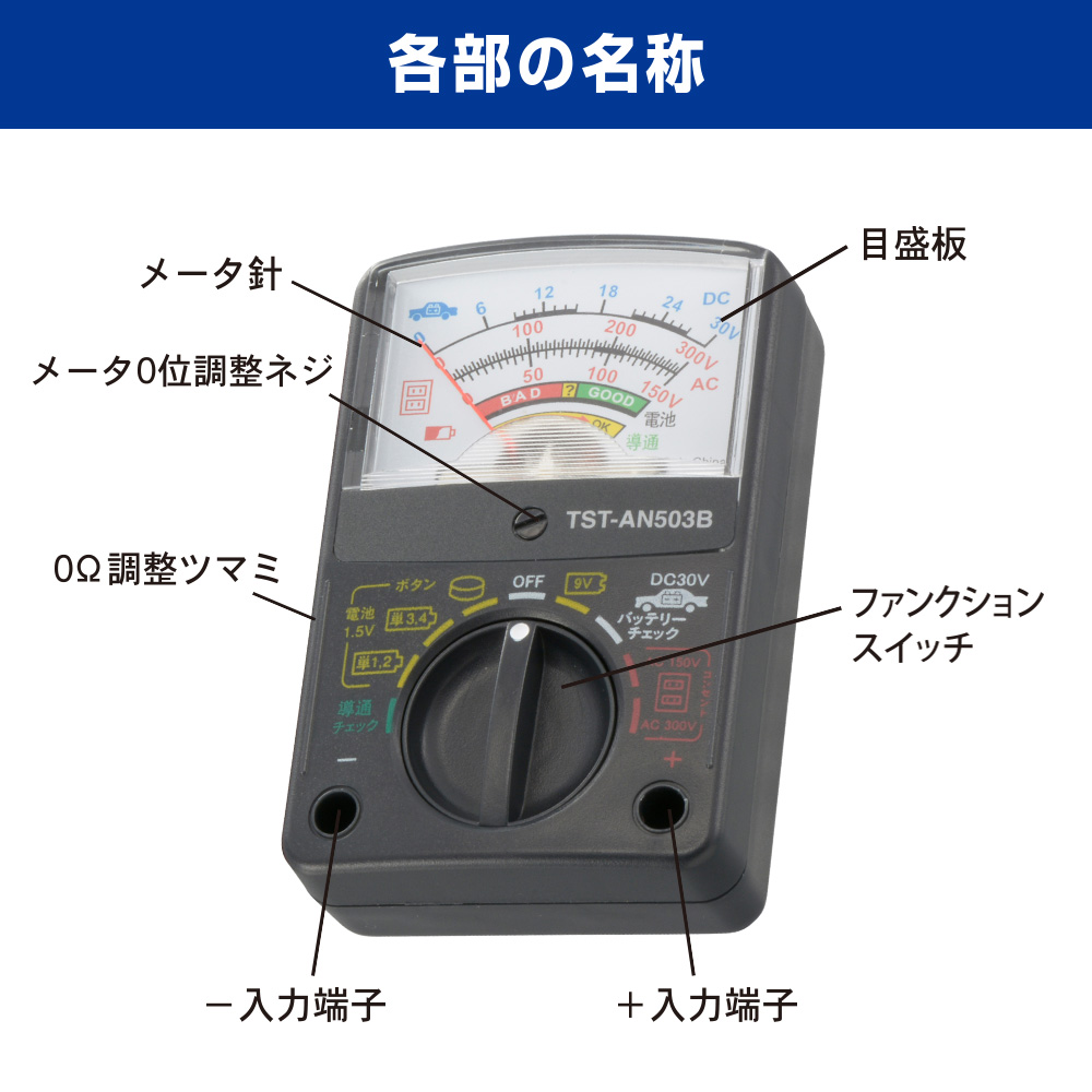 ※ このテスターは弱電(家電製品や電子機器の回路で電気容量の小さい回路)の測定に使用するものです。強電(工業用電力ライン)や高周波機器(電子レンジ等)の高圧測定は危険ですので、絶対にしないでください。人身事故や感電事故の原因となります。